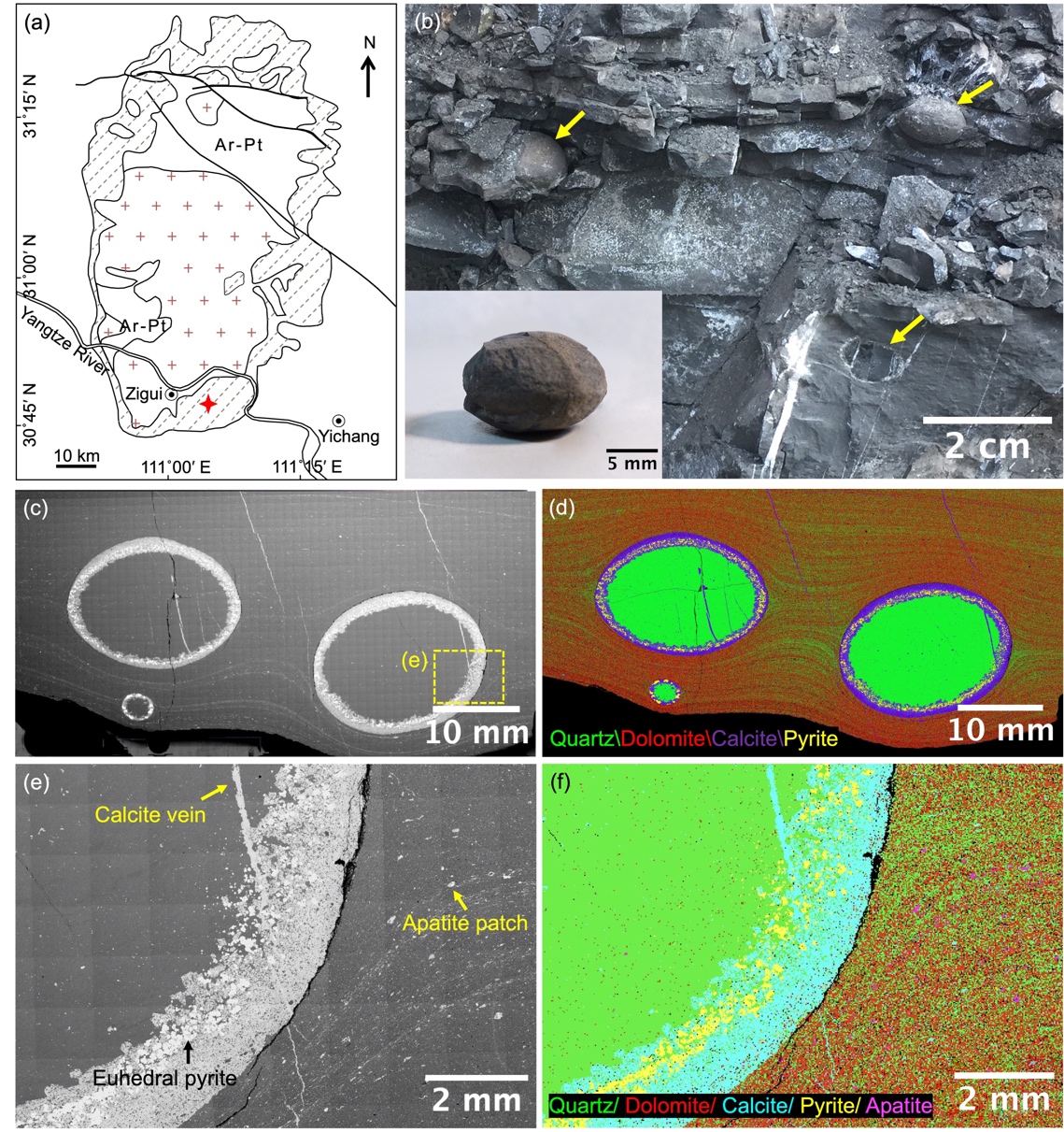 图1 湖北宜昌三峡地区地质简图、采样露头以及硅质结核的微结构和化学特征。(a) 宜昌峡东地区地质简图;(b) 陡山沱组Ⅱ段的黑色岩系及硅质结核; (c) 岩石样品截面的背散射扫描电镜图像;(d) 图像(c)对应的石英(绿色)、白云石(红色)、方解石(紫色)和黄铁矿(黄色)四种矿物空间分布的叠加图;(e) 图像(c)中黄色虚线框指示区域的部分硅质结核及其围岩的放大图像;(f) 图像(e)对应的石英(绿色)、白云石(红色)、方解石(青色)、黄铁矿(黄色)和磷灰石(粉色)五种矿物空间分布的叠加图