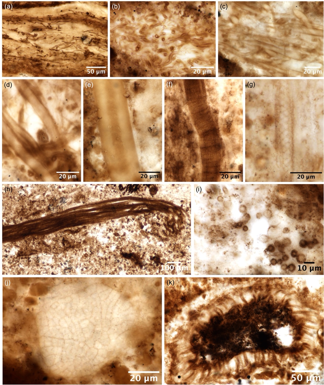 图3 九龙湾段陡山沱组Ⅱ段硅质结核内的微化石光学显微照片。(a) Siphonophycus septatum;(b) Siphonophycus robustum;(c) Siphonophycus typium; (d) Siphonophycus kestron;(e) Siphonophycus solidum;(f) Salome hubeiensis; (g) Obruchevella parva;(h) Polytrichoides lineatus;(i) Myxococcoides;(j) Wengania minuta;(k) Tianzhushania spinosa