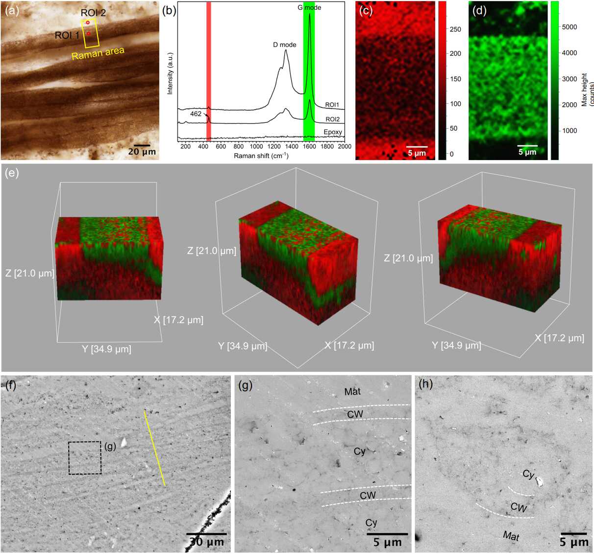 图4 丝状微化石Polytrichoides lineatus (P. lineatus)的拉曼显微光谱和扫描电镜分析。(a) P. lineatus的光学显微照片;(b) 微化石体、相邻非化石基质以及制备岩相薄片的环氧树脂所对应的拉曼光谱;(c,d) 图像(a)中黄色实线框指示区域的石英(436-481 cm-1) (c)和碳质材料(1531-1660 cm-1) (d)的二维拉曼图像;(e) 图像(a)中黄色实线框指示区域的三维拉曼图像;(f) P. lineatus的背散射扫描电镜图像;黄色实线显示FIB-SEM切割位置;(g) 图像(f)中的黑色虚线框指示区域的放大图像;(h) P. lineatus的背散射扫描电镜图像(斜剖面);细胞壁(或细胞外鞘) (CW);细胞质(Cy);非化石基质(Mat)