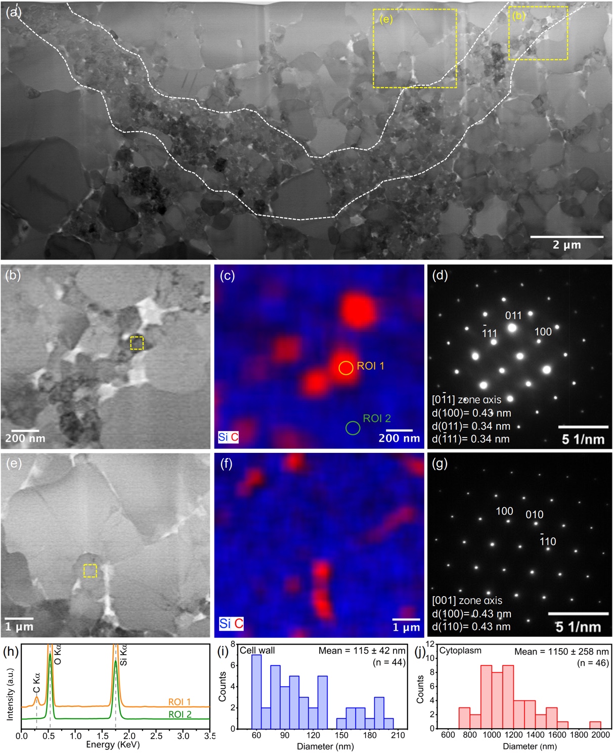 图5 丝状微化石Polytrichoides lineatus的透射电镜特征。(a) 图像4f中黄色实线对应位置获得的超薄切片的部分HAADF-STEM图像。白色双曲线指示细胞壁或细胞外鞘的位置;(b) 图像(a)中黄色虚线框指示区域的放大图像,显示细胞壁或细胞外鞘内的纳米级石英颗粒;(c) 图像(b)对应的Si(蓝色)和C(红色)的元素空间分布的叠加图;(d) 图像(b)中的黄色虚线框指示区域的SAED图像,对应石英晶粒的[0-11]带轴;(e) 图像(a)中黄色虚线框指示区域的放大图像,显示细胞质内的微米级石英颗粒;(f) 图像(e)对应的Si(蓝色)和C(红色)的元素空间分布的叠加图;(g) 图像(e)中的黄色虚线框指示区域的SAED图像,对应石英晶粒的[001]带轴;(h) 图像(c)中ROI 1(富碳物质)和ROI 2(石英颗粒)标记区域的STEM-EDXS谱图;(i,j) 细胞壁(或细胞外鞘) (i)和细胞质(j)中石英颗粒的粒径分布