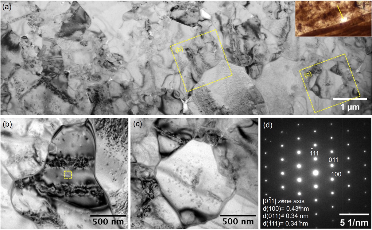 图6 丝状微化石Polytrichoides lineatus相邻的非化石基质的透射电镜特征。(a) 非化石基质的亮场TEM图像;右上角插图显示FIB-SEM切割位置;(b,c) 图像(a)中的黄色虚线框指示区域的放大图像,显示非化石基质中形状规则,紧密堆积的石英颗粒;(d) 图像(b)中黄色虚线框指示区域的SAED图像,对应石英晶粒的[0-11]带轴