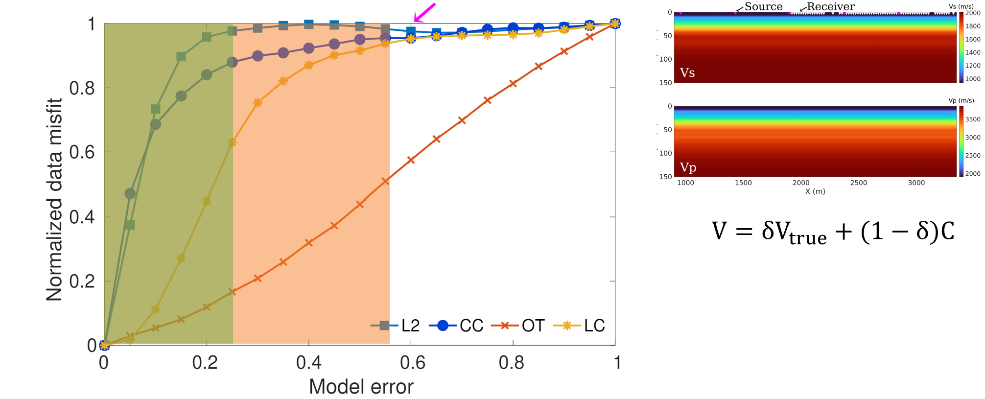 油气理论与方法学科中心的张振东特聘研究员、刘伊克研究员联合沙特阿卜杜拉国王科技大学Tariq Alkhalifah教授,提出了波动方程地震面波全频散谱反演方法。该方法将传统一维面波频散曲线反演方法和最新的地震全波形反演理论相结合,通过数值方法求解弹性波波动方程模拟地震面波在任意复杂介质中的传播过程,避免了传统方法对地下结构的层状模型近似;将复杂的地震面波波形变换到保留其频散特征的频散谱域进行数据比较(图1),避免了拾取频散曲线且可以自动利用各阶频散信息;提出了频散谱相减、频散谱全局互相关、频散谱最优输送和频散谱局部互相关四种目标函数,比较了不同目标函数的凹凸性、找到了一种全局最优目标函数(图2)。借助全波形反演统一理论框架,使用伴随状态法计算速度模型梯度和局部优化算法迭代更新速度模型,可实现大规模地震资料的自动处理。该反演思想可推广至一般反问题,即将复杂的地震波形变换到保留其主要特征的简单空间(如神经网络的隐空间)进行比较,降低反演的非线性。随着油气、地热、二氧化碳封存等陆地勘探目标的涌现,该方法有望为陆地和浅海探区高精度速度建模提供一种新的解决方案。