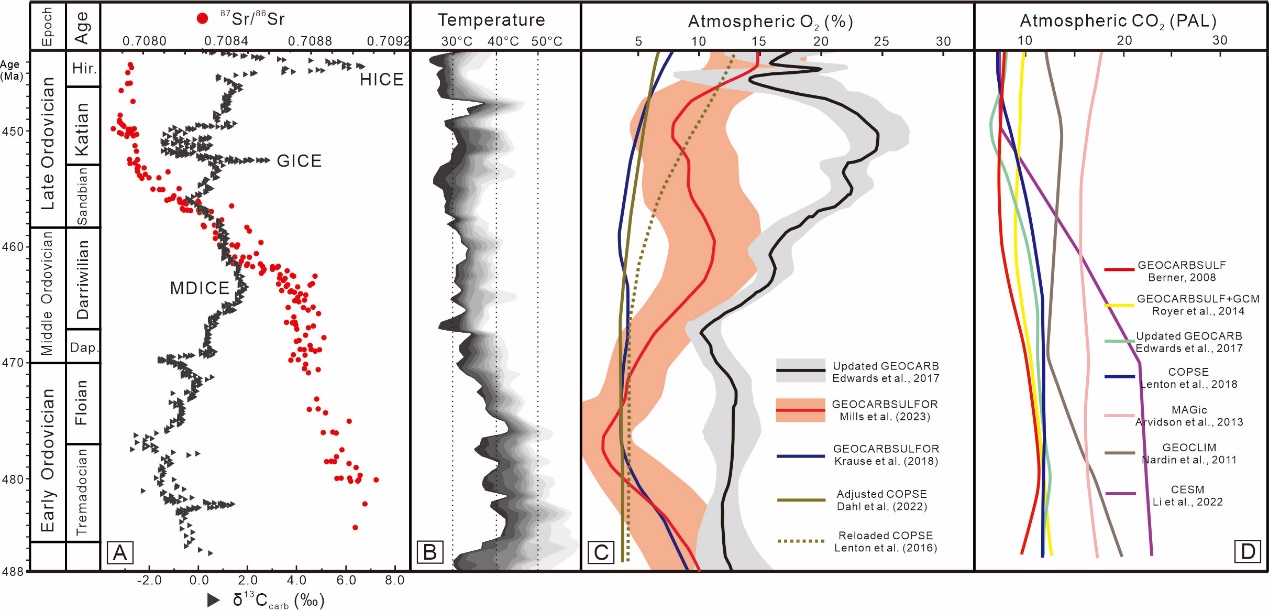 图1 奥陶纪时期关键地质和环境参数。(A) 全球海水87Sr/86Sr曲线(红色圆圈),海洋碳酸盐δ13C曲线(黑色三角形);(B) 氧同位素古温度恢复曲线;(C)和(D) 不同模式对大气O2和CO2模拟的结果