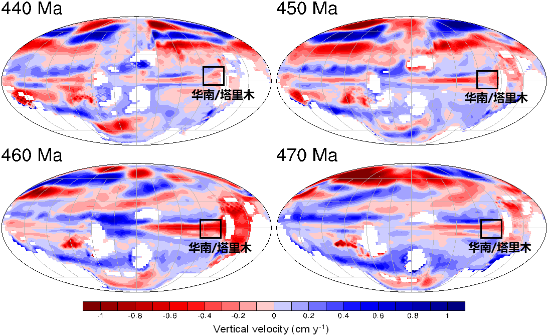 图2 平衡态模式模拟的4.7亿年至4.4亿年前年平均海水垂直速度的差异(单位:m/y;正值表示向下速度,负值表示向上速度)。可见460 Ma时,冈瓦纳大陆西侧赤道附近地区(如华南、塔里木等地)的上升流显著增强