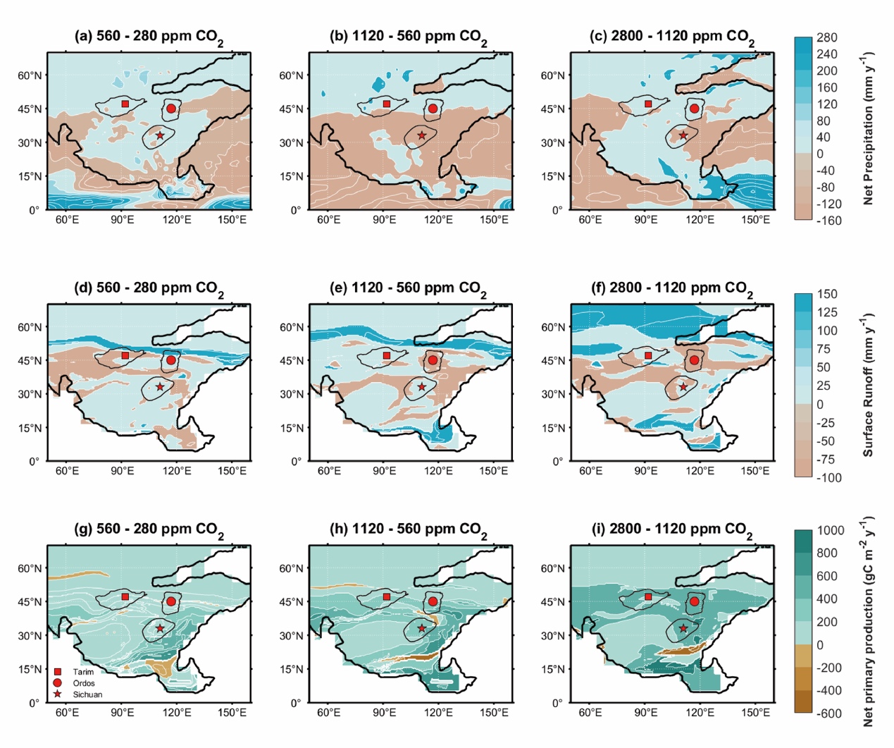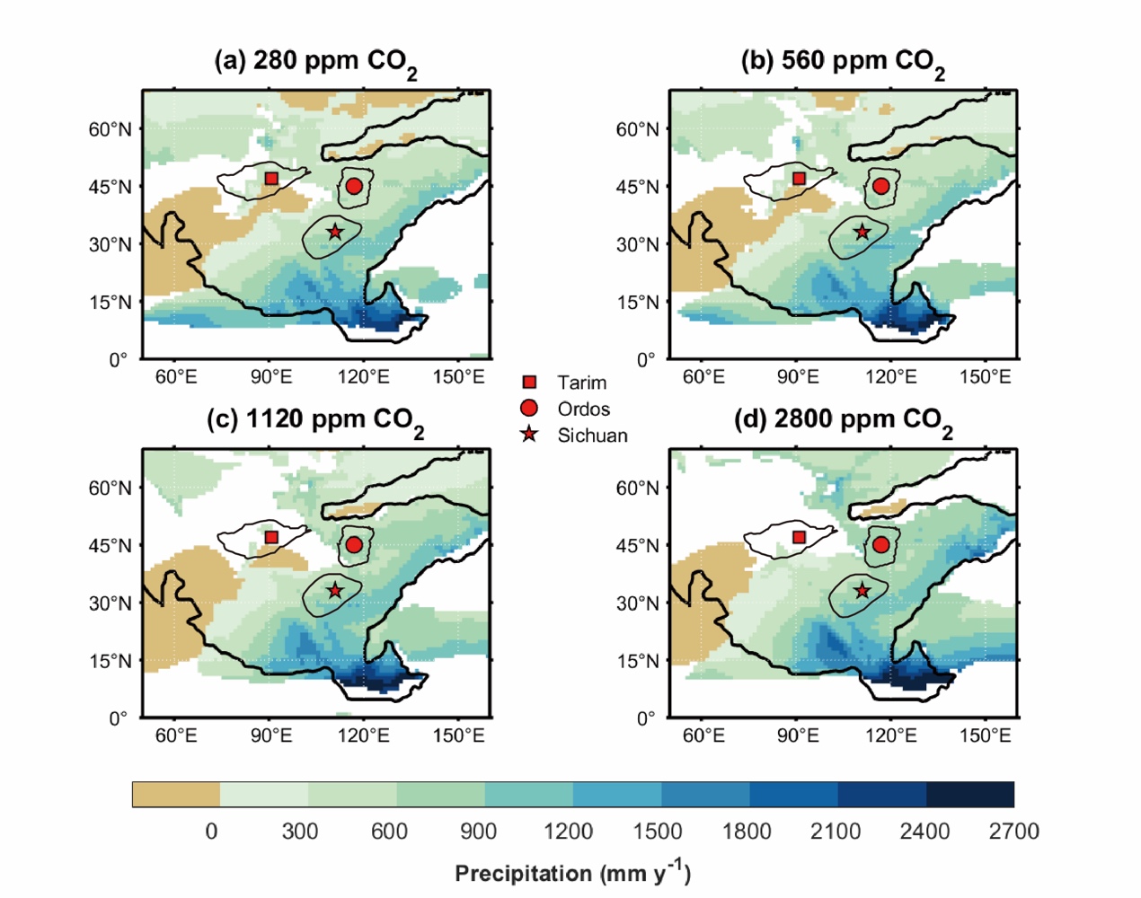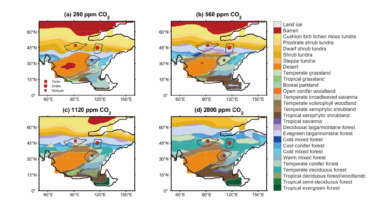 除水分通量外,变暖驱动下的植被更替亦深刻影响湖泊有机碳埋藏的空间格局(图4)。四川与鄂尔多斯盆地始终位于季风区内,其植被类型在CO2升高情境下变化较小,湖泊有机碳主要来源于湖内初级生产者(如藻类),碳埋藏依赖于径流携带的营养物质以维持水体生产力。而塔里木盆地则经历了由季风区向非季风区的转换,其有机碳主要依赖于外源高等植物输入,受植被类型变化与径流耦合的双重调控。低CO2浓度阶段(280/560 ppm),塔里木盆地处于季风控制下,夏季湿润促进短周期高等植物生长,变暖诱导的植被死亡释放大量有机残体,在强径流作用下促进有机碳向湖泊输送;而在高CO2浓度阶段(1120/2800 ppm)脱离季风影响后,降水趋于全年分布均匀,优势植被向耐旱型针叶林转变,生态系统更为稳定,植被波动性下降,导致可被运移的高等植物有机质供给减少。尽管此阶段部分地区径流有所增加,但由于有机质输入受限,有机碳埋藏速率未持续提升,湖泊碳埋藏能力受到抑制。